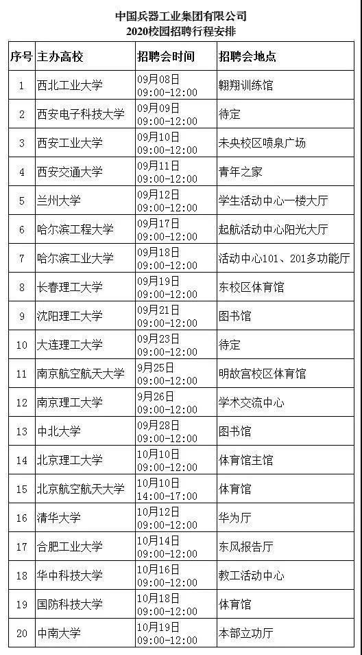 中国兵器工业集团 2020校园招聘火热来袭 只等你来哦 有梦想的青年,请往下面看 让我们携手强军报国 公司简介 我们是我军机械化、信息化、智能化装备发展的骨干 我们是全军毁伤打击的核心支撑 我们是现代化新型陆军体系作战能力科研制造的主体 我们是国家“一带一路”建设和军民融合发展的主力 我们就是 中国兵器工业集团 我们阔步迈进世界一流防务集团 资产总额3960亿元 世界500强企业排名140 中国制造业企业排名第9 连续15年获国资委经营业绩考核A级 招聘信息 面对2020年离开校园的你们,我们准备了 >>职位:1500余个 >>招聘人数:3774人 >>专业涉及: 武器类 武器系统与发射工程,弹药工程与爆炸技术,探测制导与控制技术等 机械类 机械设计制造及其自动化,车辆工程,工程力学,机械电子工程等 电子类 电气工程及其自动化,电子信息工程,通信工程,仪器仪表工程等 材料类 金属材料工程,材料成型及控制工程,高分子材料与工程,材料科学与工程等 计算机类 计算机科学与技术,计算机系统结构,计算机软件与理论,网络工程等 经管类 财务管理,工商管理,行政管理,人力资源管理,会计学,审计学等 其他 环境与安全类,临床医学,语言类,建筑学,法学,采矿工程,化学类等 行程安排 中国兵器工业集团2020届校园招聘会将在全国12个城市、20所高校举办,招聘会具体行程见下表: