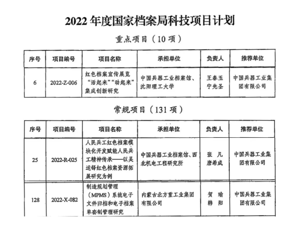 为深入贯彻落实《“十四五”全国档案事业发展规划》要求,着力提升档案科研自主创新能力,根据《国家档案局办公室关于开展2022年度国家档案局科技项目立项工作的通知》要求,中国兵器工业集团档案馆(以下简称档案馆)依据《2022年科技项目立项选题指南》,组织各单位申报成功三个档案科技项目在国家档案局立项,其中一个项目为国家级10项重点项目之一,排名第六,这是继2021年在国家档案局首次立项三个项目后的又一重大突破,标志着兵器工业档案科研工作迈上新台阶。